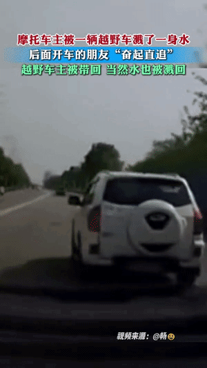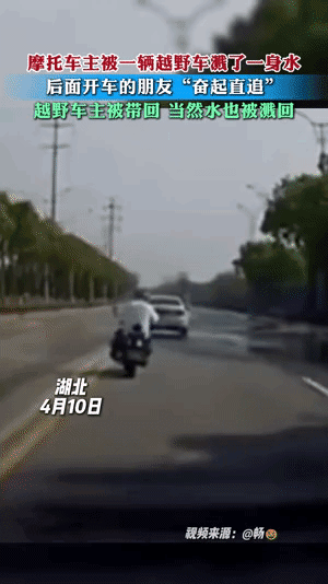 4月10日,湖北。摩托车主被一辆越野车溅了一身水,后面开车的朋友“奋起直追\"逼停越野车,让越野车主站回原地,并开车将水溅了回去!