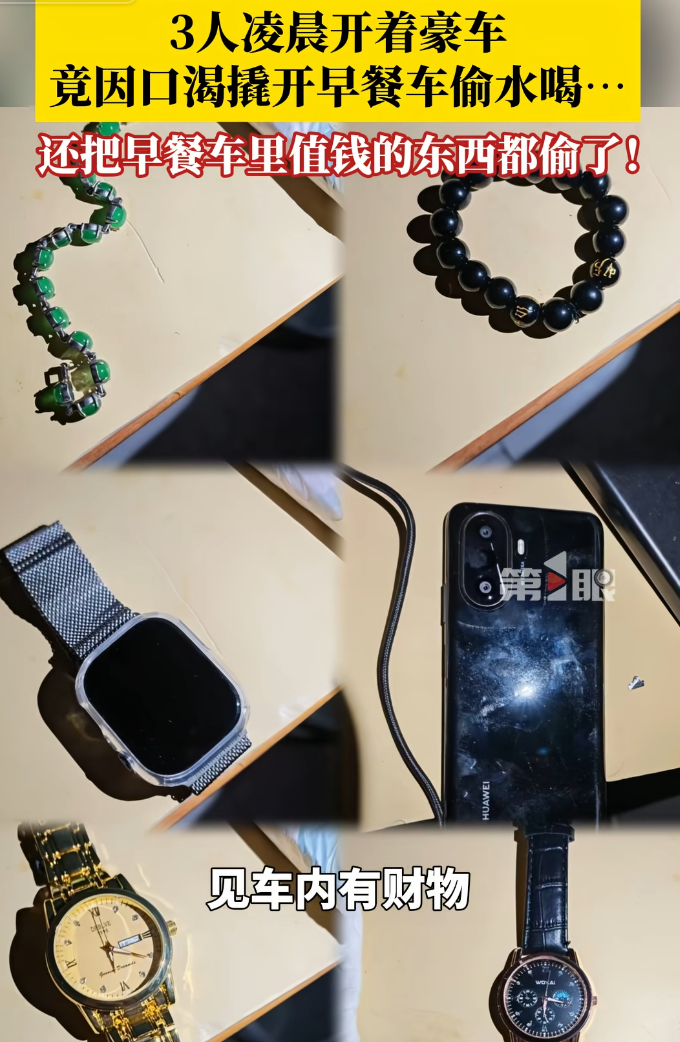 近日,上海奉贤,三人驾驶豪车偷早餐车,摊主凌晨5点多报警。经查,三人驾车途中口渴,寻找商店未果,遂盯上路边早餐车。惠某持螺丝刀撬开车体,本想找水喝,见车内有财物便临时起意实施盗窃,张某、罗某负责在外望风。目前,三名嫌疑人因涉嫌盗窃罪已被警方依法刑事拘留。
