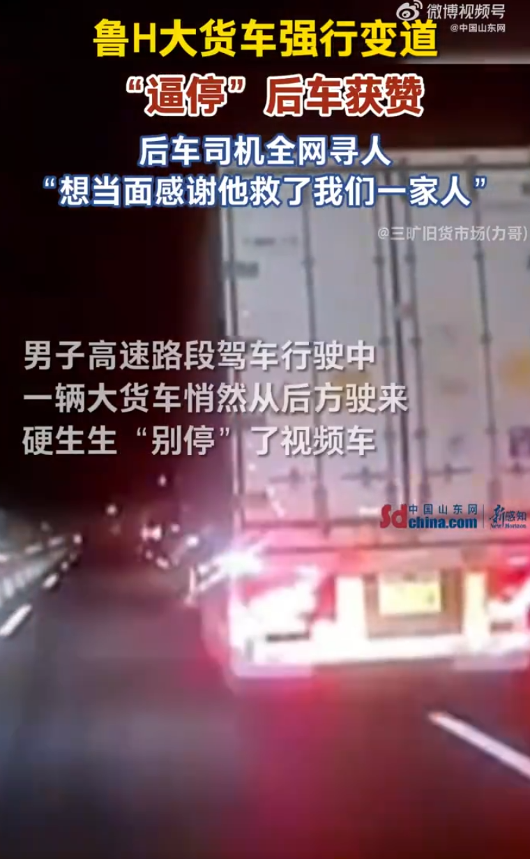 湖北赵先生带一家五口自驾游新疆途中,本想提速超车,却被一旁悬挂鲁H(山东济宁)的大货车闪着灯强行“别停”!原本满心愤怒,可当他看到大货车驶开后,行车道上竟躺着一辆侧翻货车时,瞬间破防:“是大货车司机救了我们一家五口的命!” 随后,赵先生赶上大货车并鸣笛致谢,对方也鸣笛回应。“在高速公路出口等了四五十分钟,也没等到那辆大货车。”赵先生发视频寻找这位鲁H牌照的救命恩人,只想当面说声感谢。致敬平凡英雄!