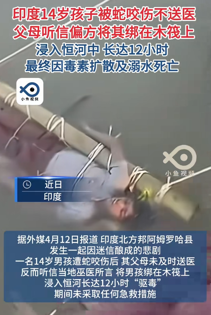 4月9日,印度北方邦阿姆罗哈县,一名14岁男孩被毒蛇咬伤,家属未选择送医,而是在”术士“的建议下,用绳索和竹架将男孩固定,将其半浸泡在恒河水中,认为这样可以“吸出”蛇毒。 男孩被泡在河水中长达12小时。在此期间,家属一直在岸边祈祷,大量群众围观。家属见没有起色,便将男孩捞起送往另一名术士,最终因毒素扩散及溺水死亡。