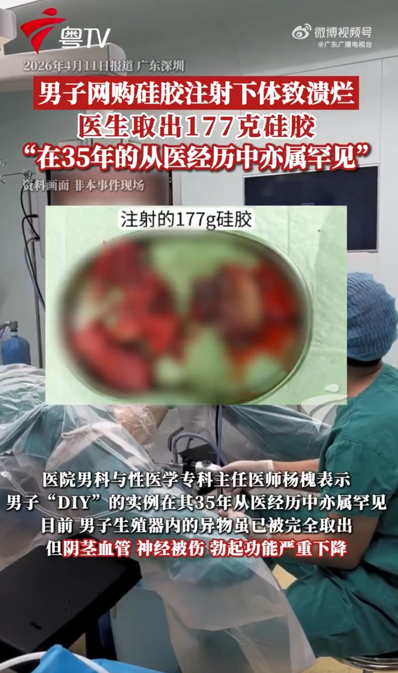 近日,深圳市松岗人民医院杨槐教授接诊了一名男子,男子网购硅胶注射“丁丁”,致生殖器及周边皮肤溃烂、流脓、发臭。虽硅胶已被取出,但部分硅胶注射在皮内,导致皮肤缺血坏死,整个器官溃烂严重,造成生殖器官损毁。杨槐教授提醒,切勿轻信网络偏方、自行注射、私自操作,以免悔恨终生。
